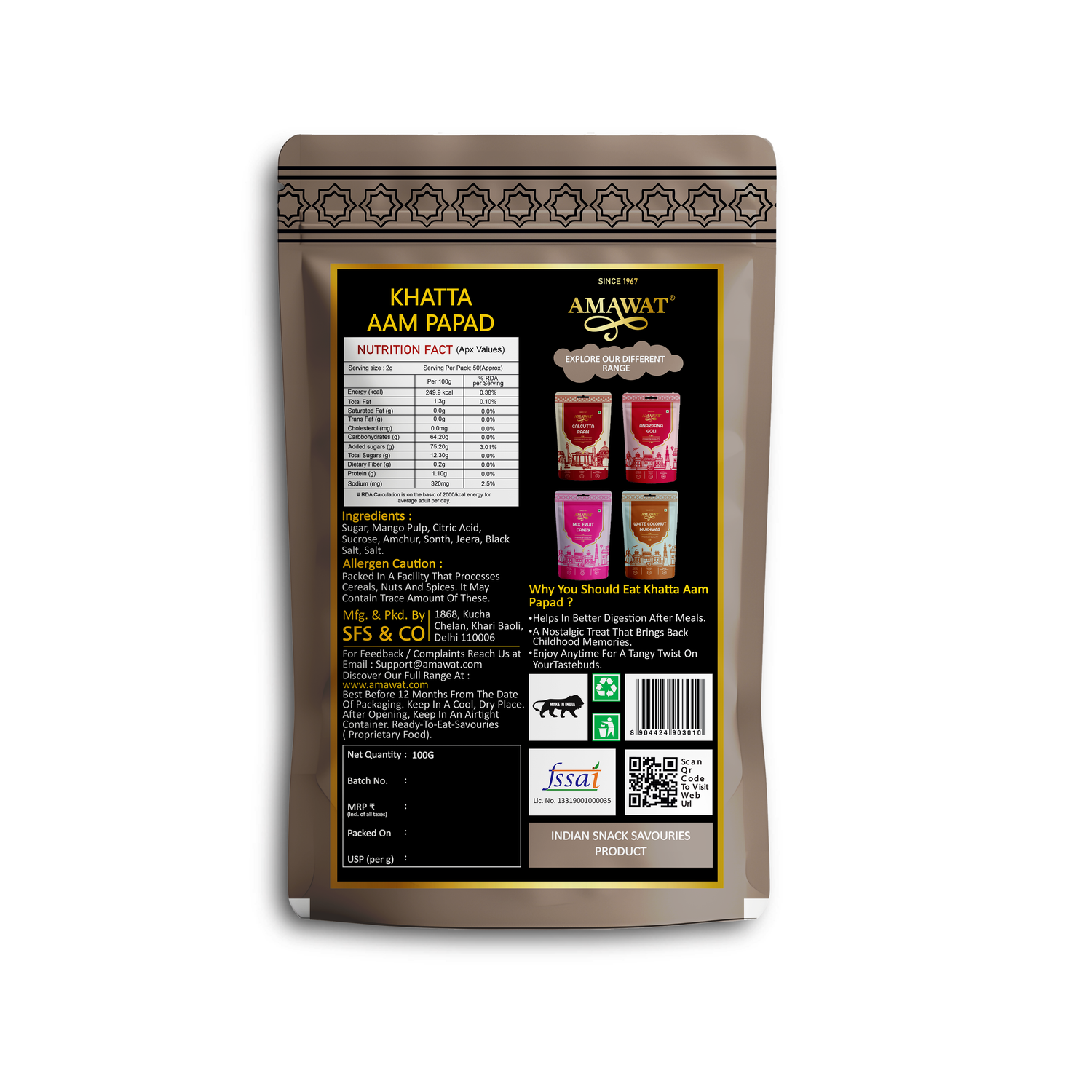 Step back into the sweet nostalgia of your childhood with Amawat's Khatta Aam Papad - Masala Aam Papad. Reminiscent of the cherished street-side treats from your school days, this delightful confectionery brings back memories of Churan Goli and Toffees with its nostalgic flavors and simple, pure fun. Crafted with care using 100% natural ingredients, our Khatta Aam Papad is a tasty indulgence and a boon for your digestive health. Each bite is a burst of authentic flavor and goodness and made with mango pulp, sugar, salt, permitted food preservatives, and a hint of tangy tamarind.