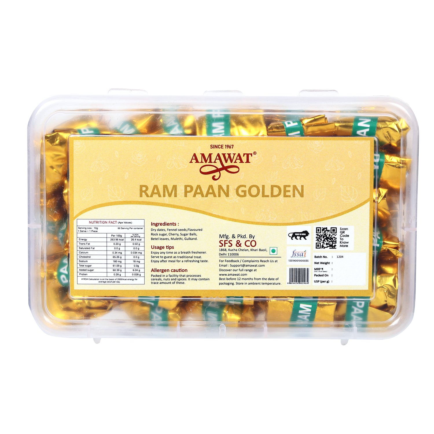 Ingredients: Betel Leaf Essence, Gulkand, Fennel Seeds, Dry Dates, Coconut, Cardamom, Sweeteners & Flavours.