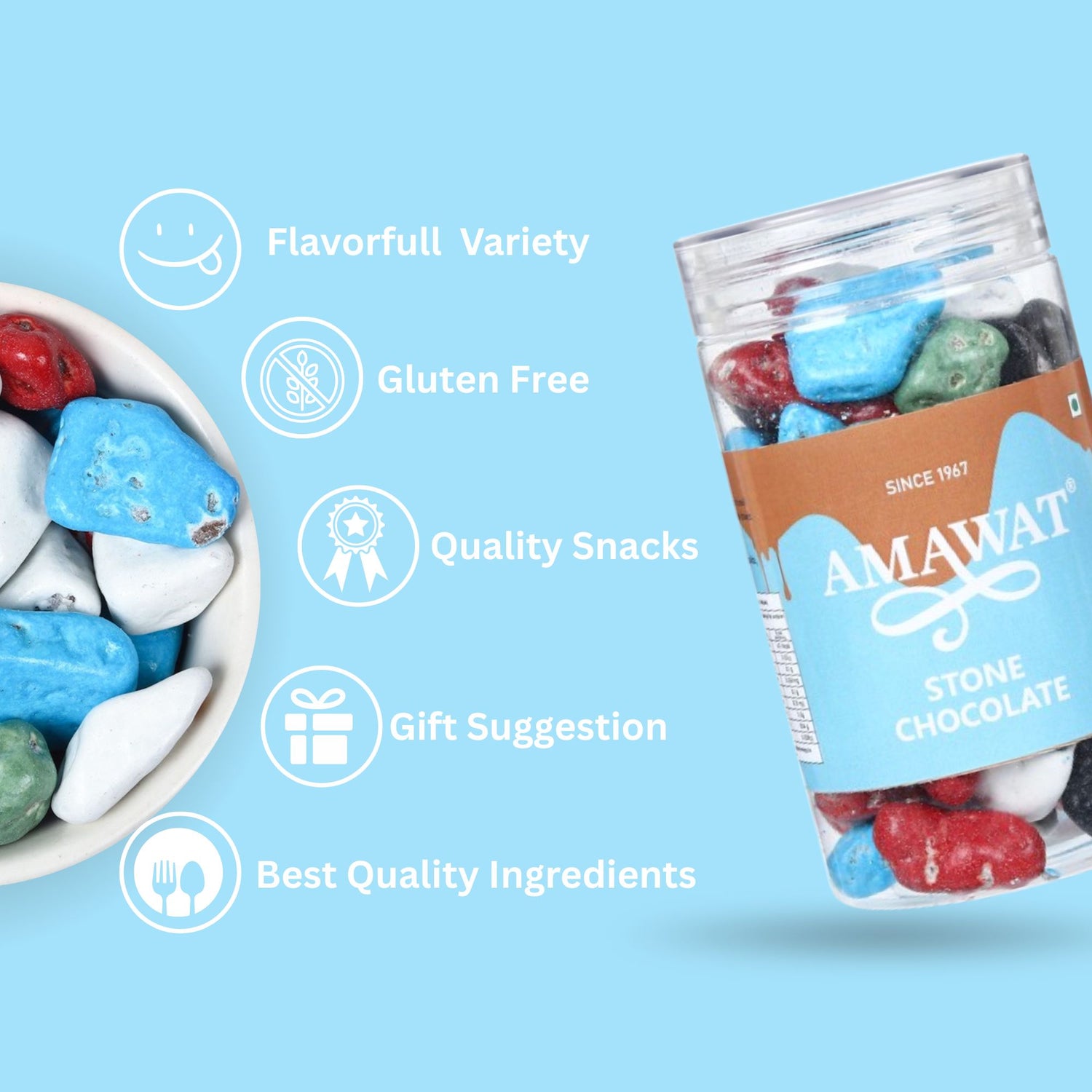 Amawat Stone Chocolate is a fun and delicious treat, shaped like colorful pebbles and packed with rich, creamy chocolate inside. These candy-coated chocolates not only look unique but also bring a delightful crunch and melt-in-your-mouth chocolatey goodness in every bite. Perfect for gifting, decorating desserts, or simply enjoying as a snack.